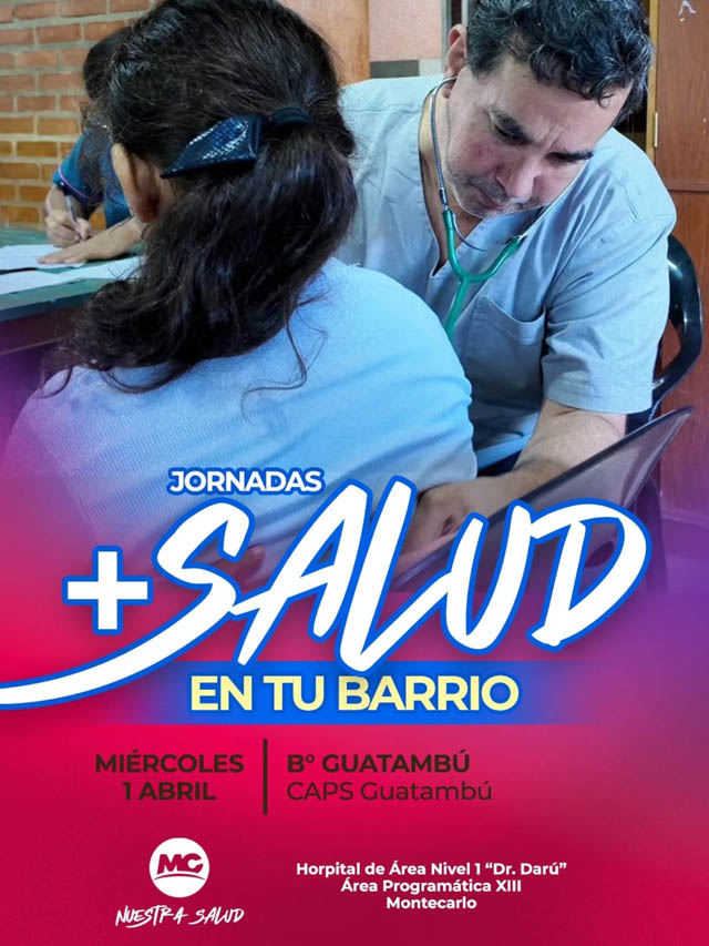 AGENCIA MISIONES.UNO | La Municipalidad de Montecarlo llevará adelante este miércoles 1 de abril una nueva jornada del programa “+ Salud en tu Barrio”, con múltiples servicios gratuitos para los vecinos en el CAPS del barrio Guatambú.