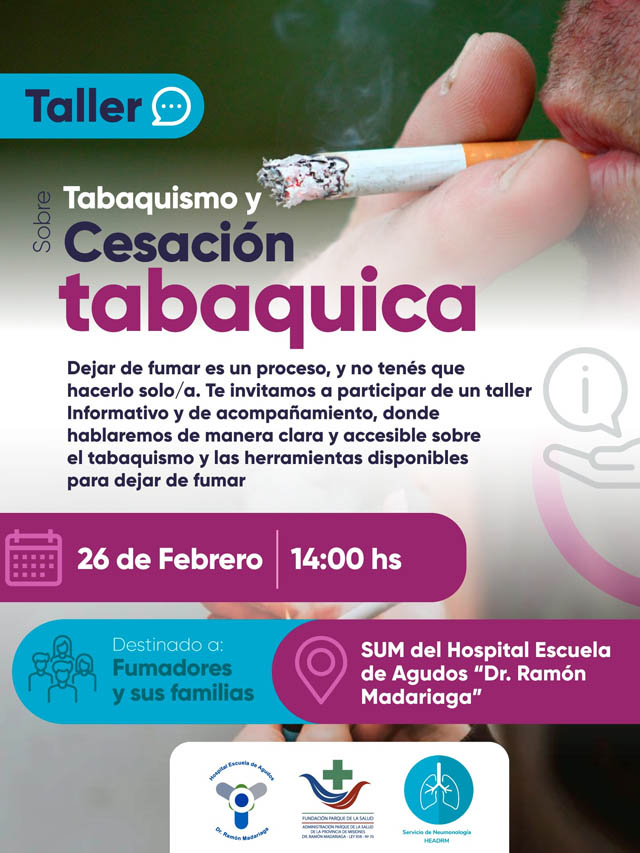 La actividad tendrá lugar a las 14:00 en el SUM del hospital y está destinada a brindar información y acompañamiento a quienes deseen iniciar el proceso para dejar de fumar. El espacio propone un abordaje claro y accesible sobre el tabaquismo y las herramientas disponibles para avanzar hacia la cesación.