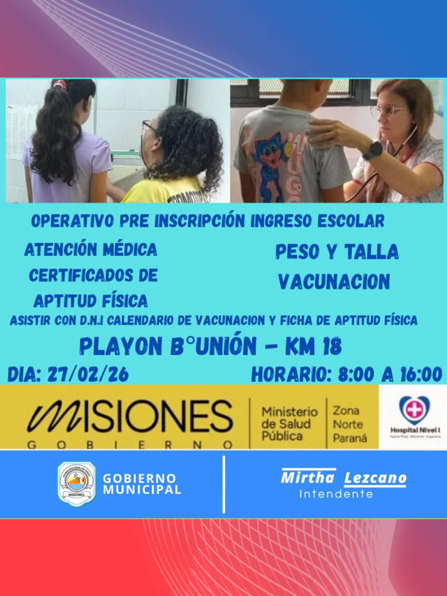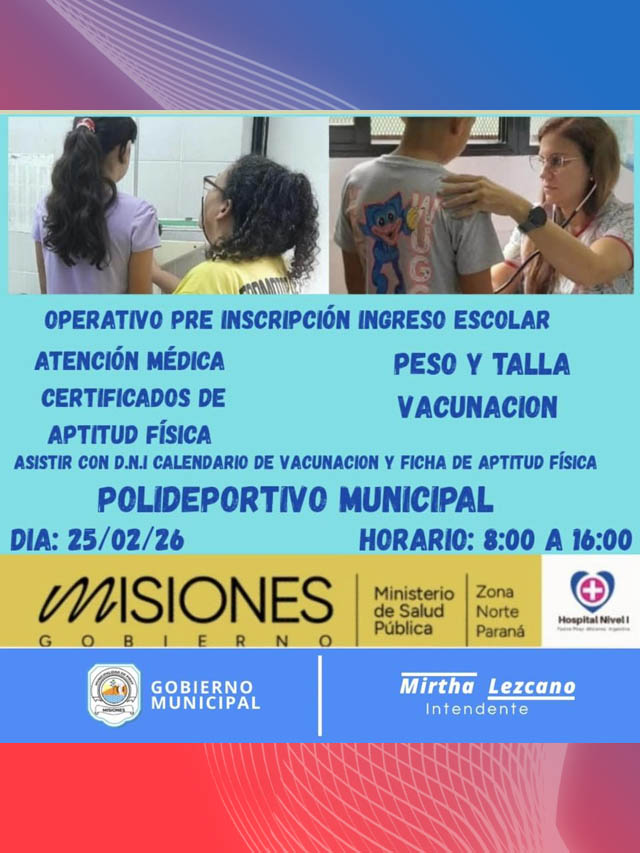 AGENCIA MISIONES.UNO | La Municipalidad de Puerto Piray llevará adelante un operativo de salud destinado a niñas y niños que deban realizar la preinscripción escolar, con controles médicos, vacunación y emisión de certificados de aptitud física.