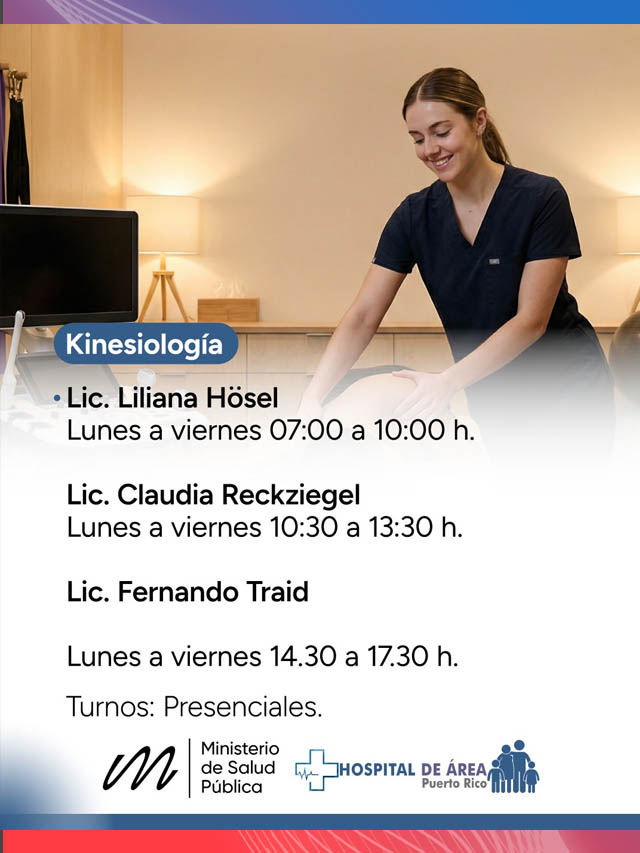 AGENCIA MISIONES.UNO | El Ministerio de Salud Pública informó los horarios de atención del Servicio de Kinesiología del Hospital de Área Puerto Rico, con turnos presenciales de lunes a viernes.